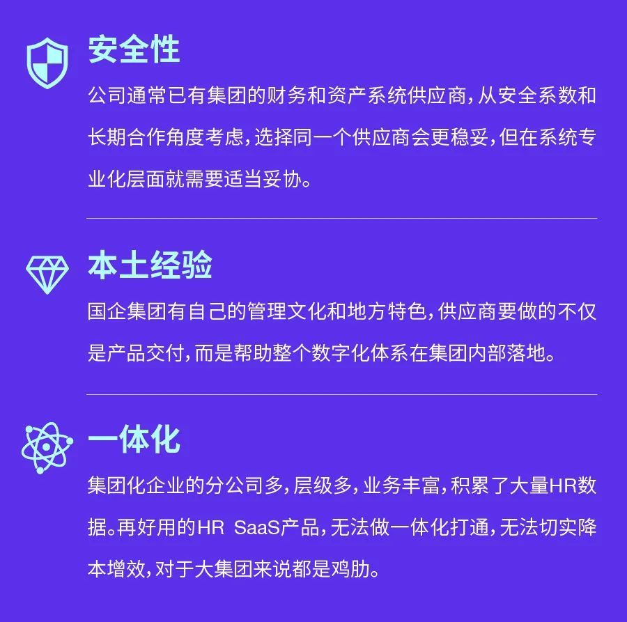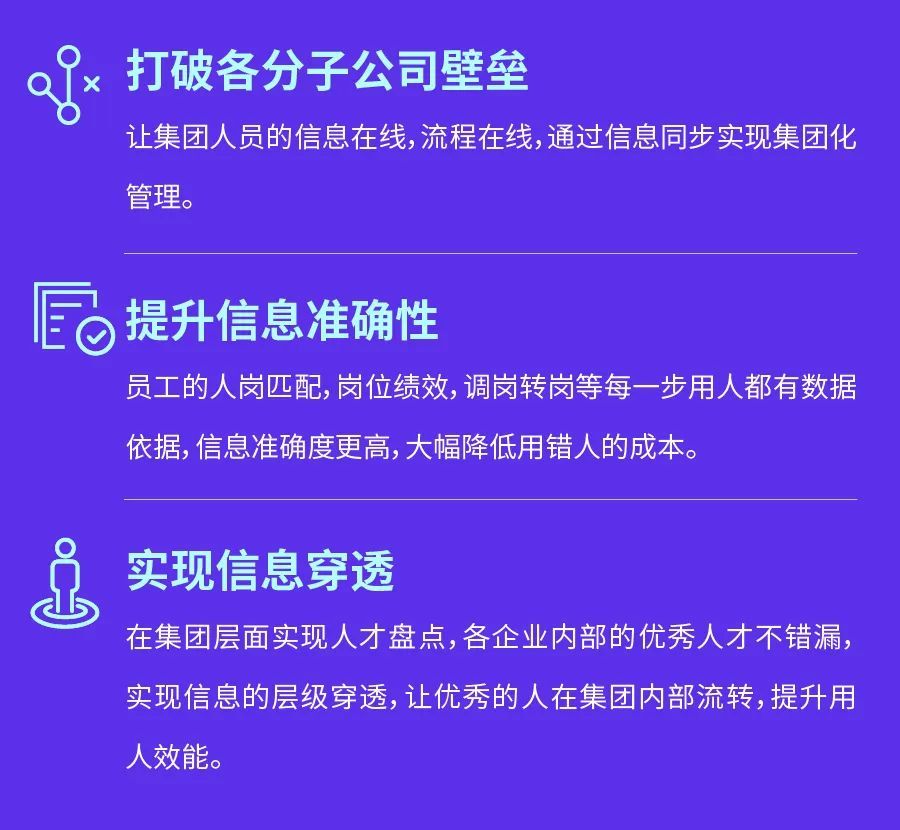总结:万人以上集团化企业因为其分子公司众多、管理水平差异、系统现状复杂等问题,HR如何重新规划数字化建设,保证系统与流程的有序衔接,同时用好数智技术实现人才信息的打通,人效的提升,是选择HR SaaS产品过程中绕不开的课题。