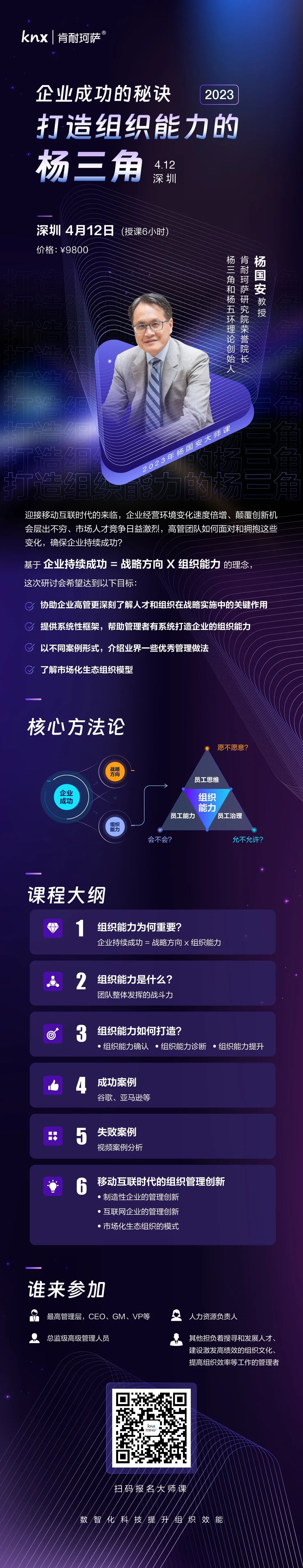 杨三角理论创始人杨国安教授,基于几十年的研究,结合杨三角理论与实践心法,打造了《企业成功的秘诀:打造组织能力的杨三角》课程,着重阐述如何应用战略人力资源的各种方法和工具,帮助公司迎接新竞争形式所带来的挑战、创造价值并获得竞争优势。