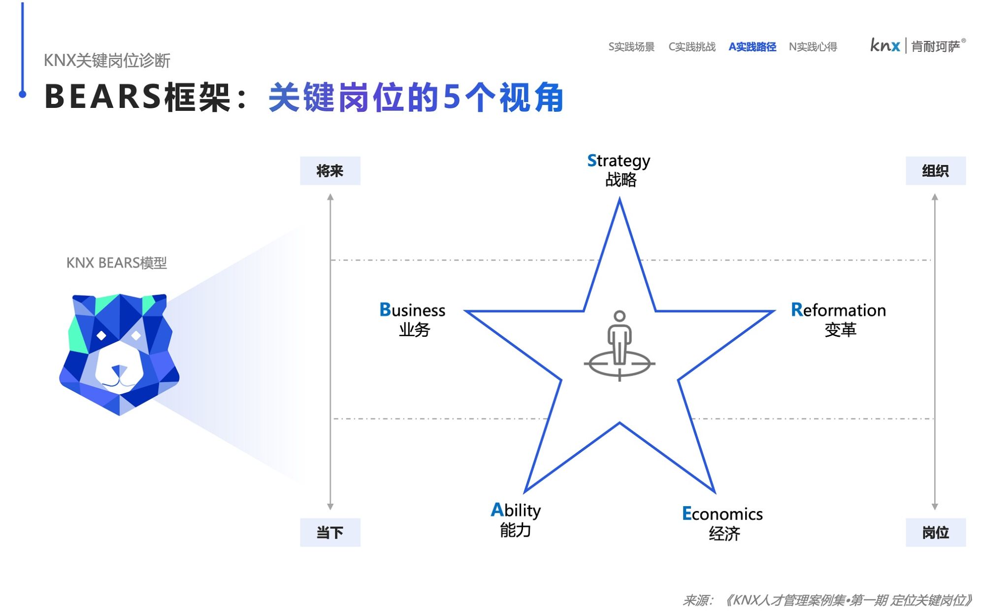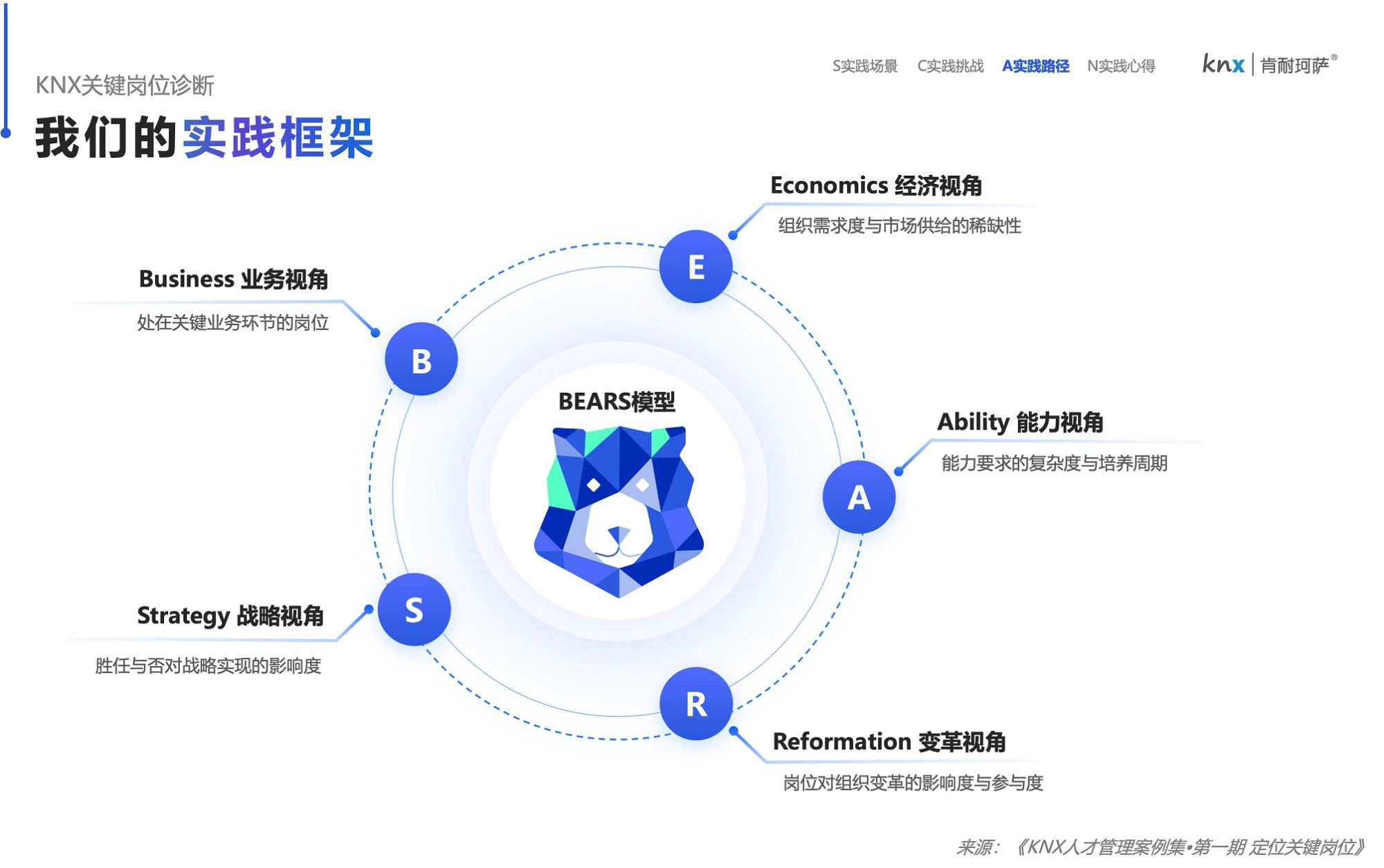 同样还是以“定位关键岗位”为例,本着循证的思想,基于不断实践的总结和提炼,我们开发出了定位关键岗位的BEARS框架。该框架内含5种视角(业务视角-经济视角-能力视角-变革视角-战略视角),每一种视角都配备了相应的方法论+算法+工具。无论选择单一视角或者组合视角,都能进行有逻辑的数据分析。