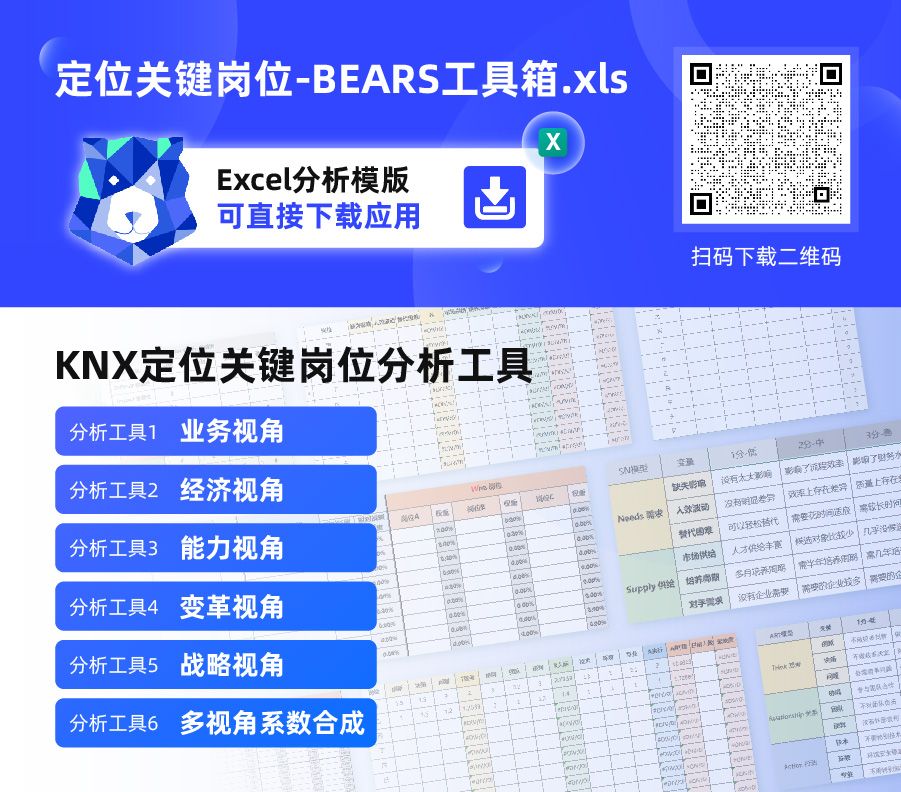 因此,我们把这套定位关键岗位的BEARS框架中分享给大家。在这个工具包中,有5大视角的方法论、以及内嵌算法的分析工具,下载即可直接套用!