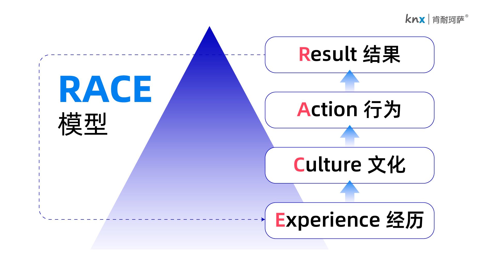 沿着这个路径,结合组织行为学的理论,我们推导出一个RACE模型,可以借用这个模型来帮助我们理解核心价值观的逻辑,并转化为实用的价值观定义工具。