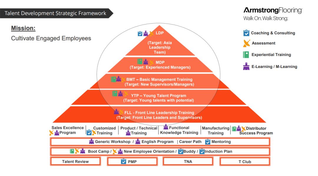 阿姆斯壮地材在几十年的发展中立足美国集团总部传统培训方式进行人才培养,然而在西方国家,大部分企业都在使用E-Learning的培训方式,美国阿姆斯壮也不例外,并且该培训方式在西方国家也已经发展了相当长的时间。
