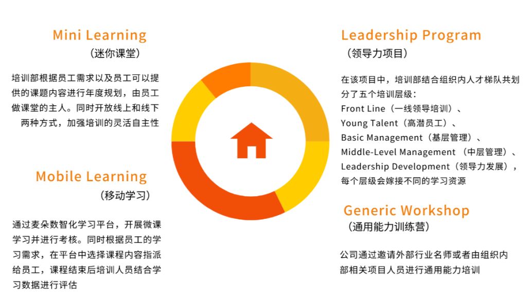 经过反复实践,培训部门沉淀了一套适合当前企业人才培养和学习发展的策略。首先根据公司内部人才梯队制定了不同的学习目标,形成了本地化的领导力发展项目,层层拆解,以此来契合员工和企业的双向发展。