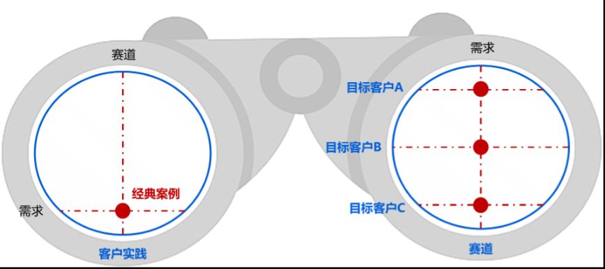 在To B业务中,客户经常会问:你们有同行的实践案例吗?复制成功典范也是开拓策略之一,本报告中为读者提供一个“望远镜引导模型”,帮助业务团队在同一个赛道同类需求上不断积累行业实践,树立行业壁垒。
