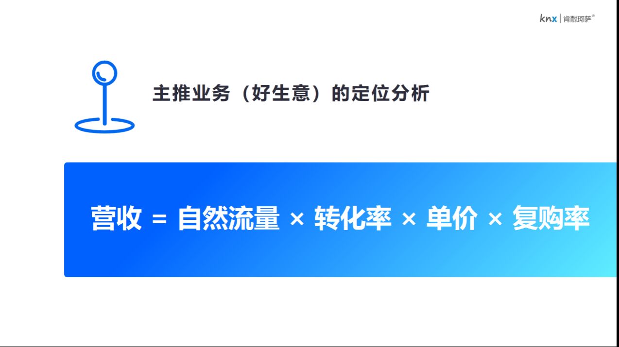 哪些业务可能会带来增量,是需要重点去推广的?对于这个问题的解答,本报告也为大家提供一套引导思路。首先,梳理清楚你所在企业的业务框架;然后,基于“营收=自然流量×转化率×单价×复购率”这个公式,围绕这四个指标进行业务价值分析,定位到值得推广的核心业务。