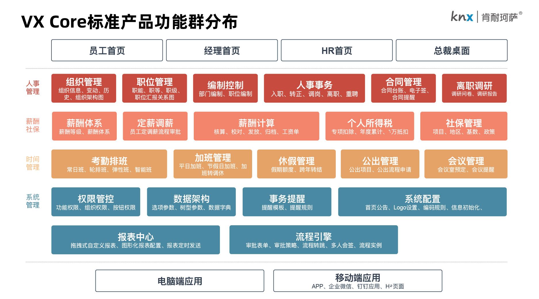 我们 VX Core 产品拥有人事管理、薪酬社保、时间管理、系统管理四大功能群,帮助您将员工信息、考勤数据、薪酬管理等内容集中在一个平台上,所有数据实现实时同步,避免因信息滞后导致的决策失误,显著提升整体工作效率。