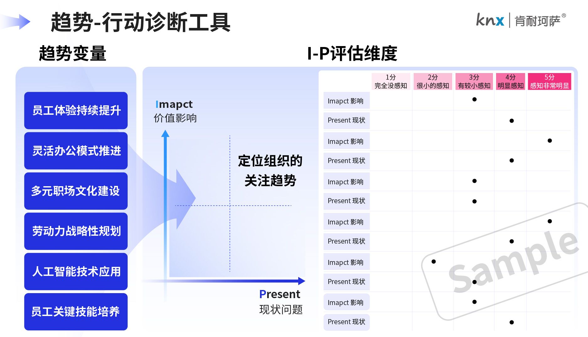 本诊断工具基于IP模型(Impact价值影响+Present现状问题),通过计算“I+P”两个维度的值来评估趋势的关注需求程度,即具有显著影响且存在相关问题。组织内部可通过调研管理群体的意见来确定,哪些趋势是2025年值得组织关注的,凡是得分超过6分的趋势点,我们建议整个组织都应予以重视。