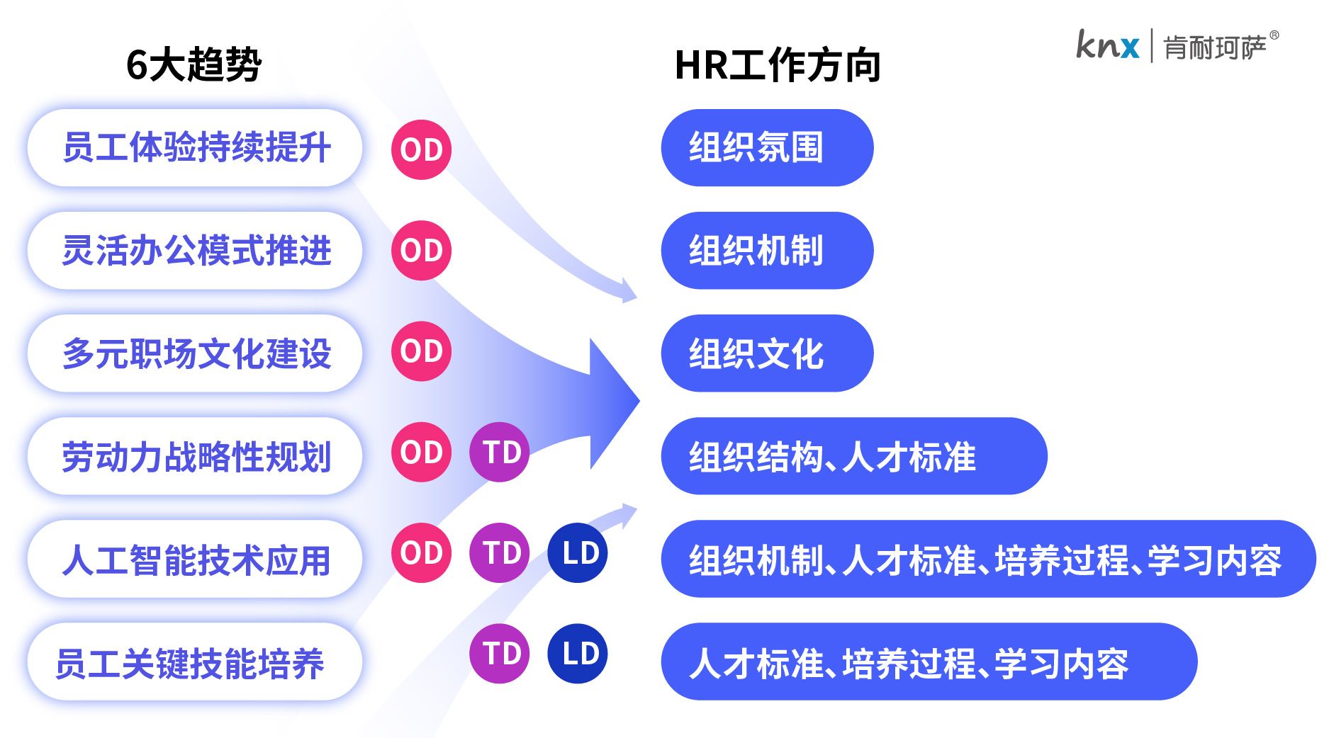 首先,把上述Top6大趋势与我们的人力资源开发(Human Resources Develop)的工作框架进行关联,可以看到每个趋势在不同人力资源工作模块中的应用方向: