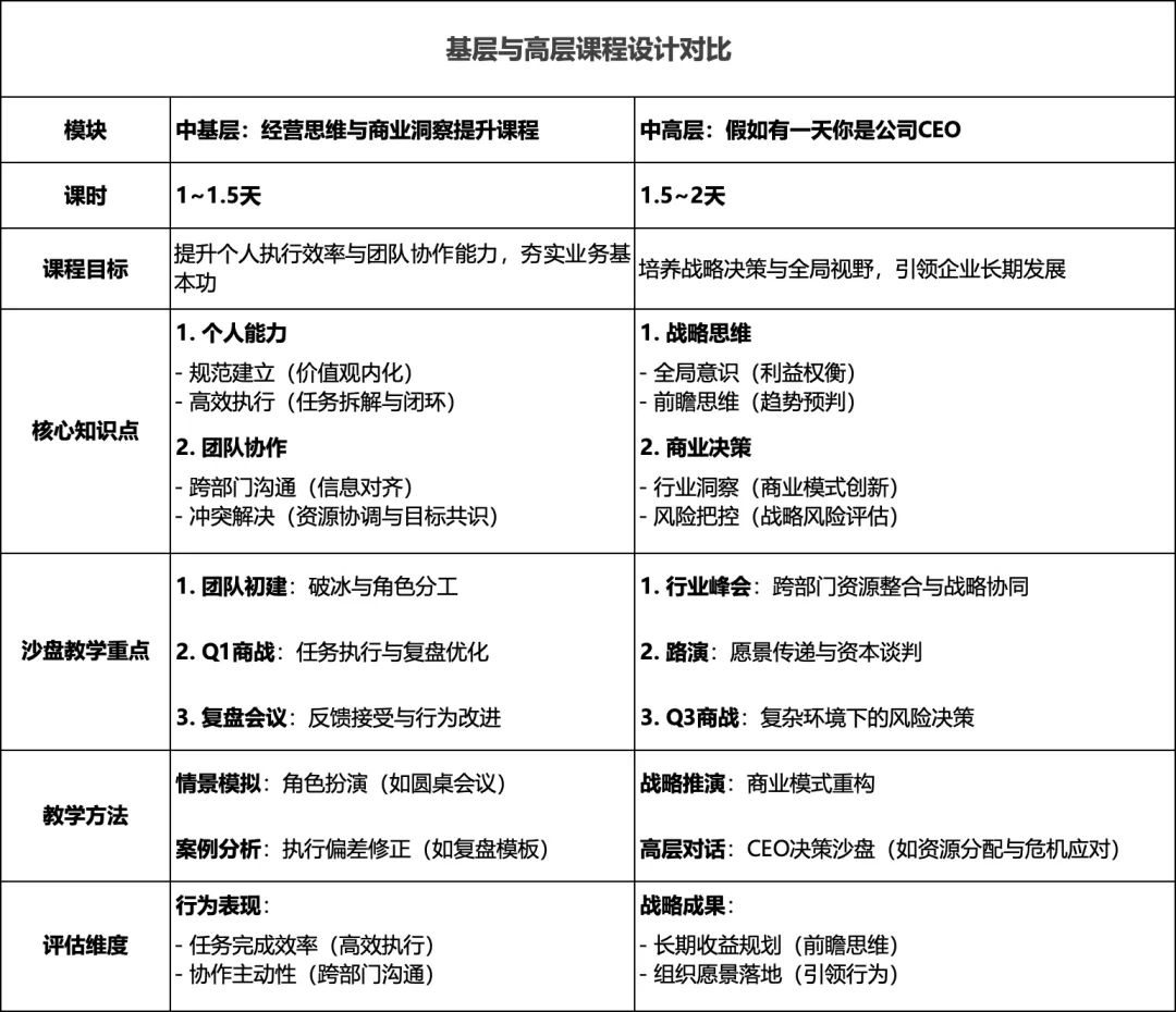 针对不同的学员,设计了适合中基层的《经营思维与商业洞察提升》课程,核心关注在提升个人能力与团队协作效率,夯实业务执行基础,聚焦“怎么做”,通过标准化流程与协作工具提升执行力。中高层学员以《假如有一天你是公司CEO》课程,核心关注在构建战略思维与全局视野,引领组织长期发展,聚焦“为什么做”,通过战略沙盘培养决策深度。基层学员需理解战略背景(如“商业理解”),高层需关注执行可行性(如“持续改善”)。