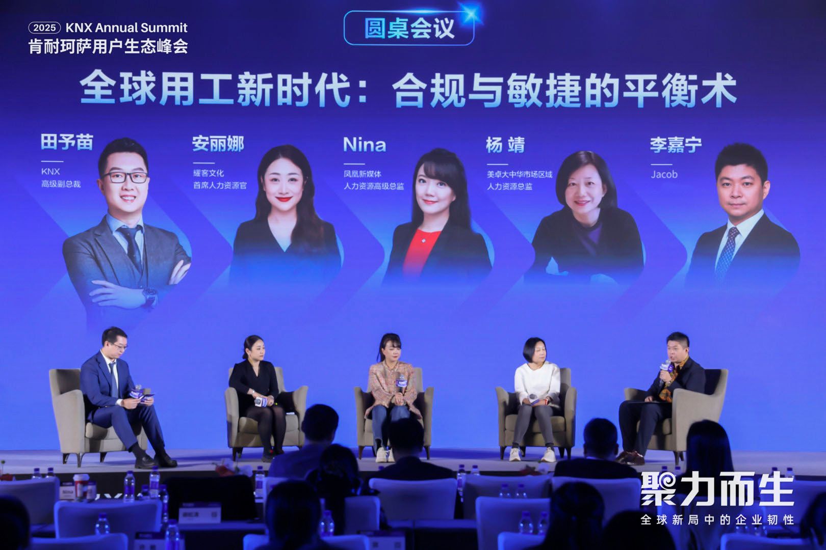 大会最后进入圆桌论坛,由肯耐珂萨高级副总裁田予苗主持。圆桌嘉宾包括凤凰新媒体 Nina、美卓大中华杨靖、耀客文化安丽娜以及李嘉宁先生。几位嘉宾围绕“全球用工新时代:合规与敏捷的平衡术”展开深入讨论,涉及多国合规、PE 风险预判、跨文化管理、全球招聘与激励机制等多个企业当前最关注的议题。嘉宾们从不同产业视角给出了鲜活案例和应对策略,使现场听众受益匪浅。